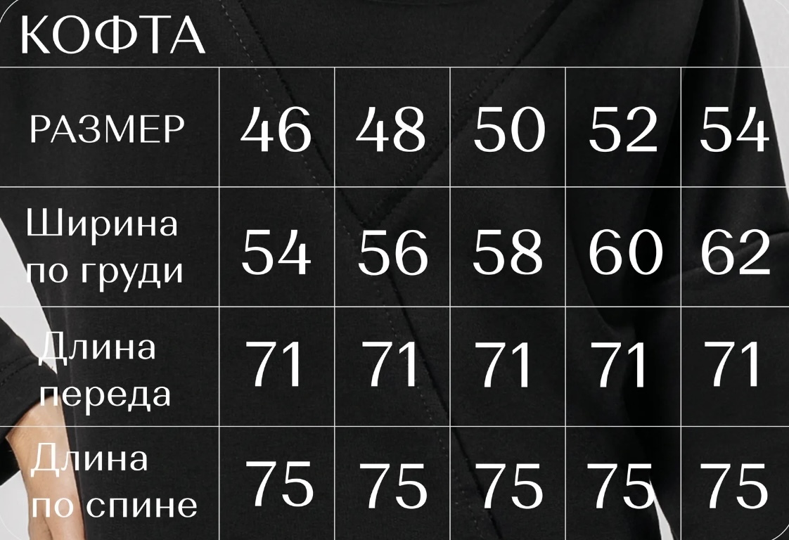 Теплый осенний костюм из мягкой трёхнитки сочетает уют и элегантность. Кофта с воротником-хомут и покроем «летучая мышь» образует мягкий силуэт, скрывающий недостатки и подчеркивающий достоинства, а декоративный шов в виде буквы Y придаёт образу оригинальность.
